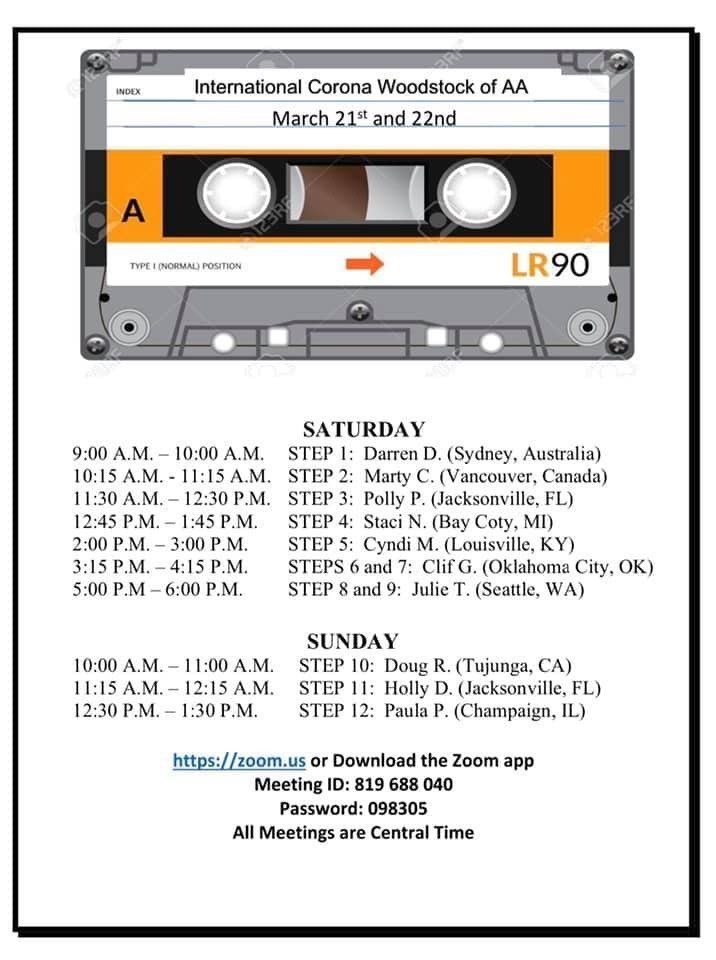 The Corning Hospital Big book Study Group is starting a online Big Book Meeting go to www.zoom.com and use the Meeting info: